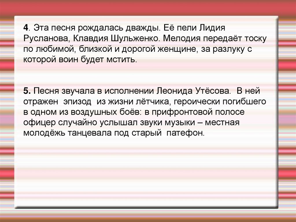 4. Эта песня рождалась дважды. Её пели ЛидияРусланова, Клавдия Шульженко. Мелодия передаёт тоску