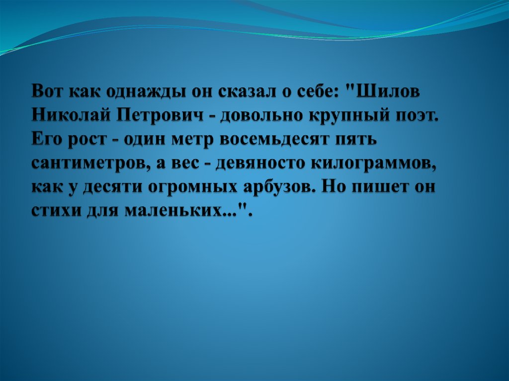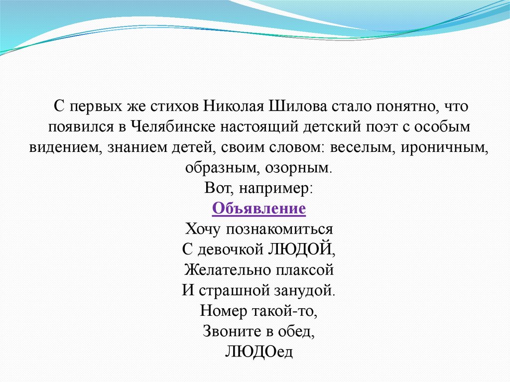 С первых же стихов Николая Шилова стало понятно, чтопоявился в Челябинске настоящий детский поэт с особым