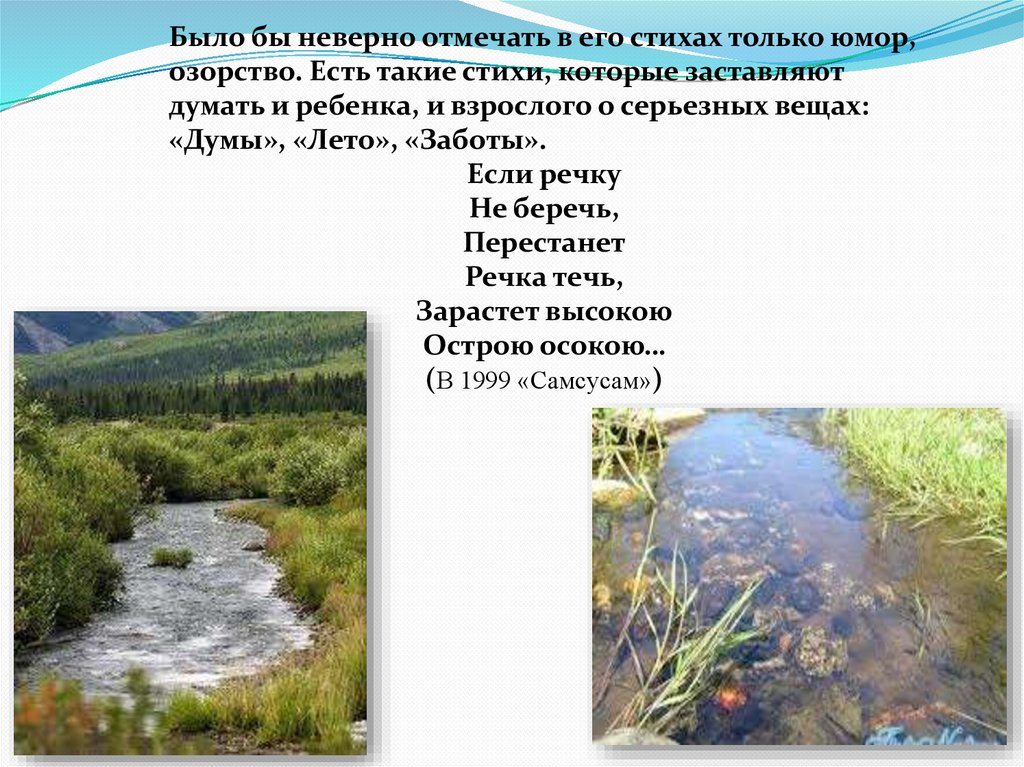 Было бы неверно отмечать в его стихах только юмор,озорство. Есть такие стихи, которые заставляют