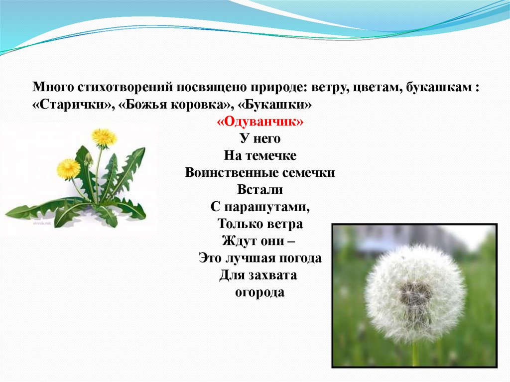 Много стихотворений посвящено природе: ветру, цветам, букашкам :«Старички», «Божья коровка», «Букашки»
