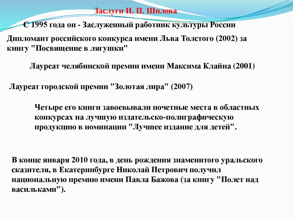 Заслуги Н. П. ШиловаС 1995 года он - Заслуженный работник культуры России