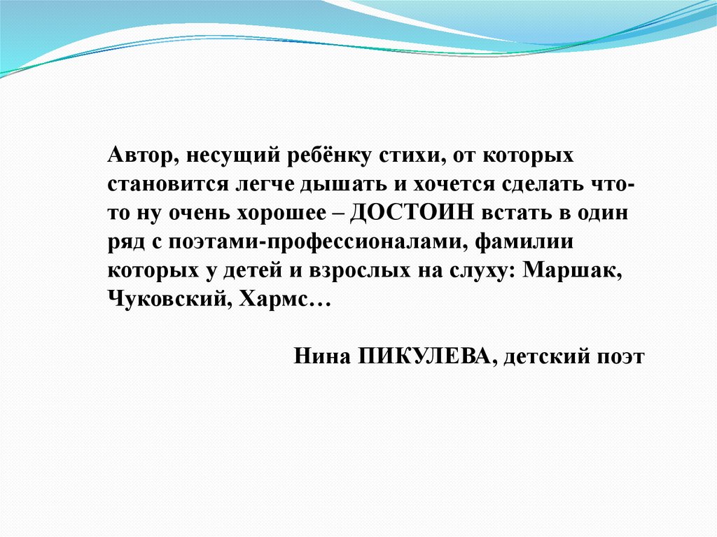 Автор, несущий ребёнку стихи, от которыхстановится легче дышать и хочется сделать чтото ну очень хорошее – ДОСТОИН встать в один