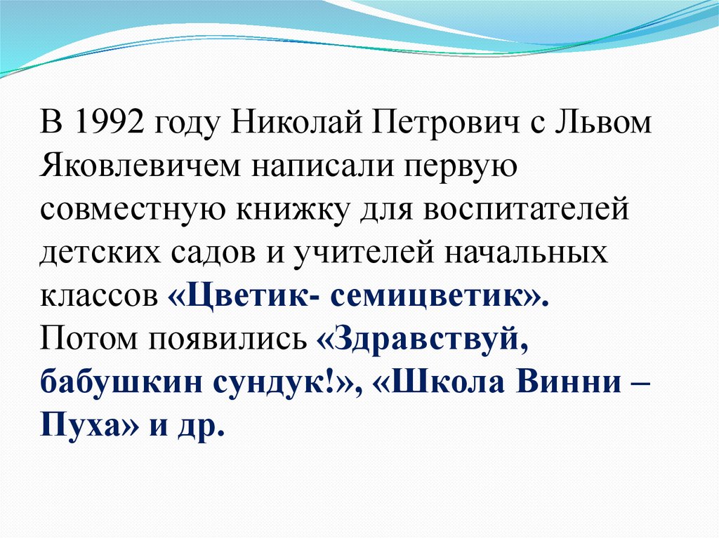 В 1992 году Николай Петрович с ЛьвомЯковлевичем написали первую