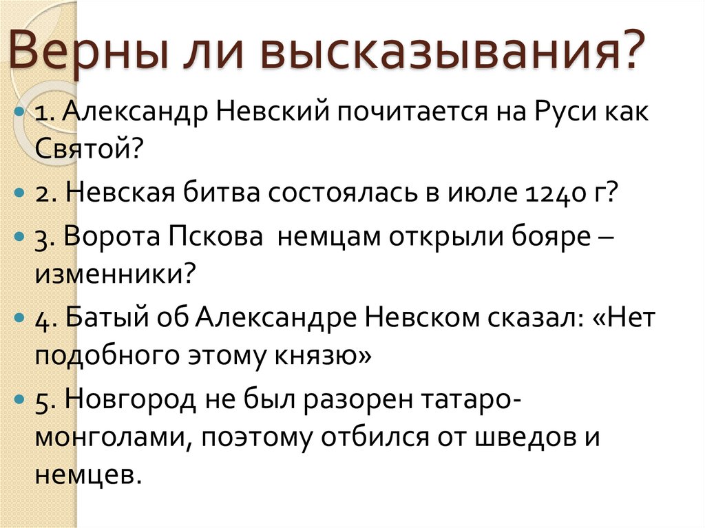 Верны ли высказывания?1. Александр Невский почитается на Руси как