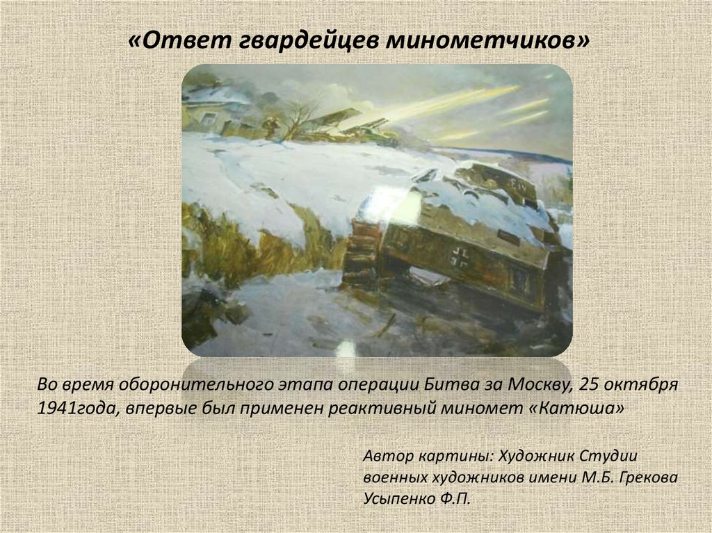 «Ответ гвардейцев минометчиков»Во время оборонительного этапа операции Битва за Москву, 25 октября