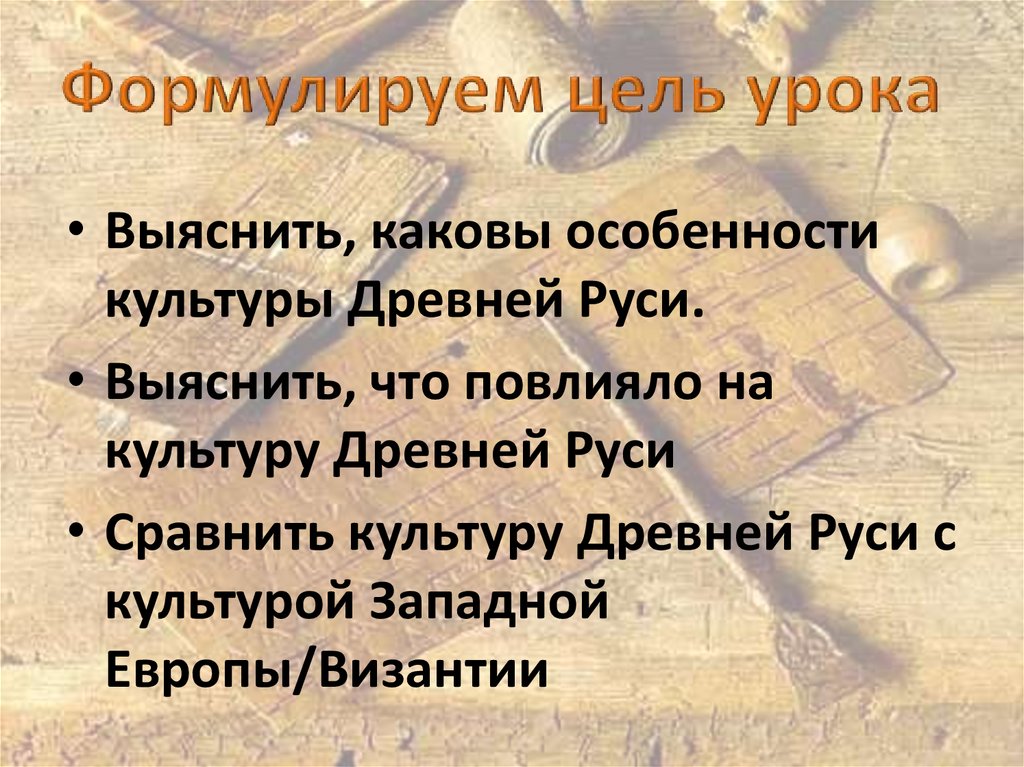 • Выяснить, каковы особенностикультуры Древней Руси.