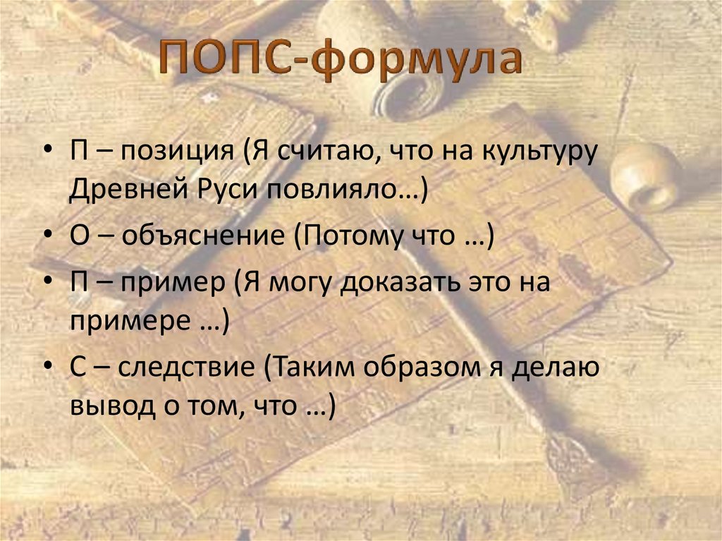 • П – позиция (Я считаю, что на культуруДревней Руси повлияло…)