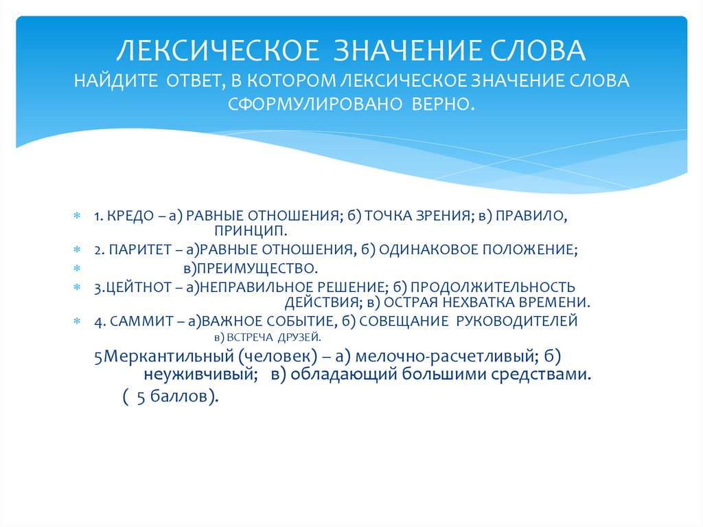 1. КРЕДО – а) РАВНЫЕ ОТНОШЕНИЯ; б) ТОЧКА ЗРЕНИЯ; в) ПРАВИЛО,