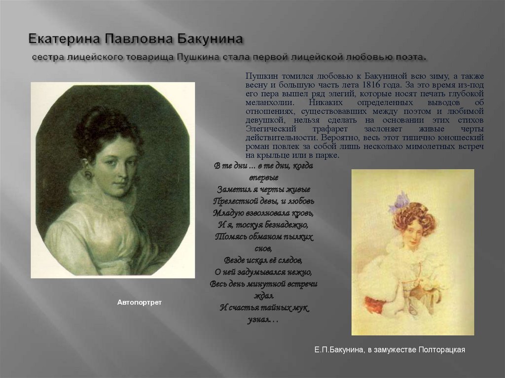 Пушкин томился любовью к Бакуниной всю зиму, а такжевесну и большую часть лета 1816 года. За это время из-под
