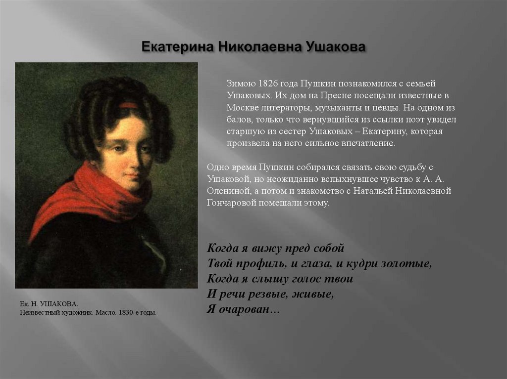 Зимою 1826 года Пушкин познакомился с семьейУшаковых. Их дом на Пресне посещали известные в