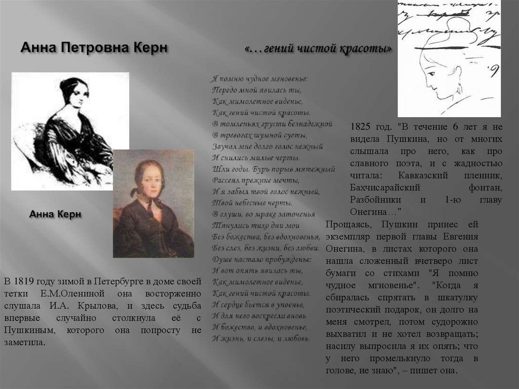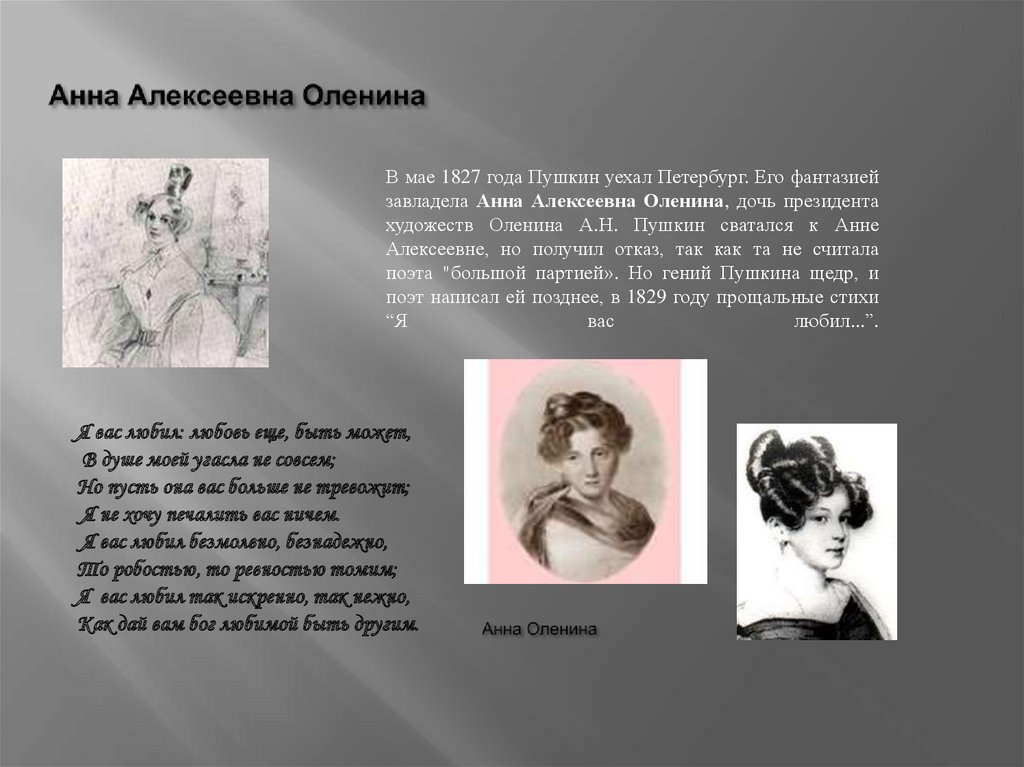 В мае 1827 года Пушкин уехал Петербург. Его фантазиейзавладела Анна Алексеевна Оленина, дочь президента