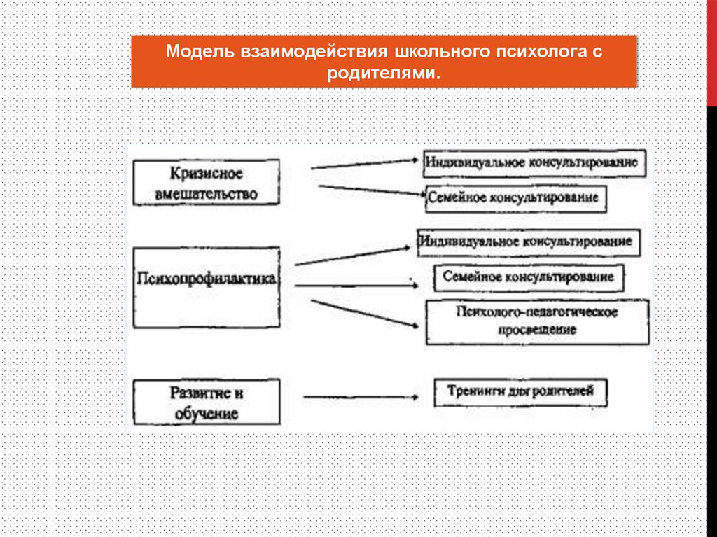 Модель взаимодействия школьного психолога сродителями.