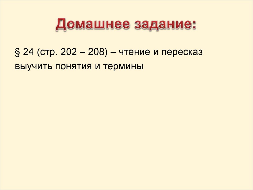 § 24 (стр. 202 – 208) – чтение и пересказвыучить понятия и термины