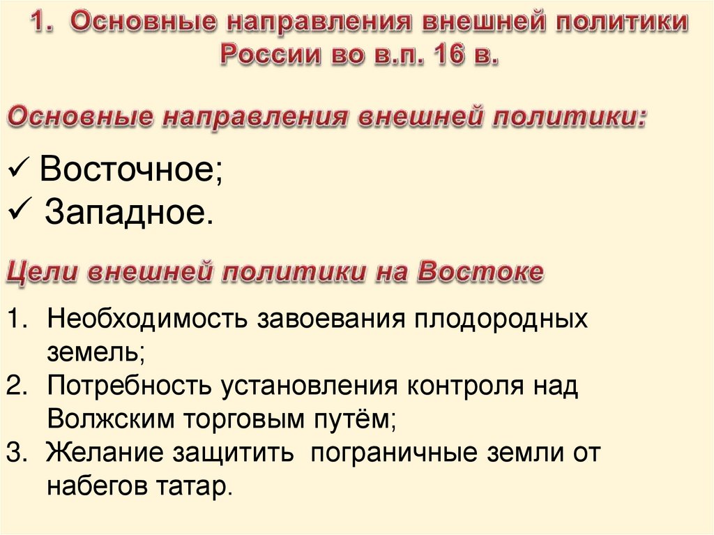 1. Основные направления внешнейполитики России во в.п. XVI в.;