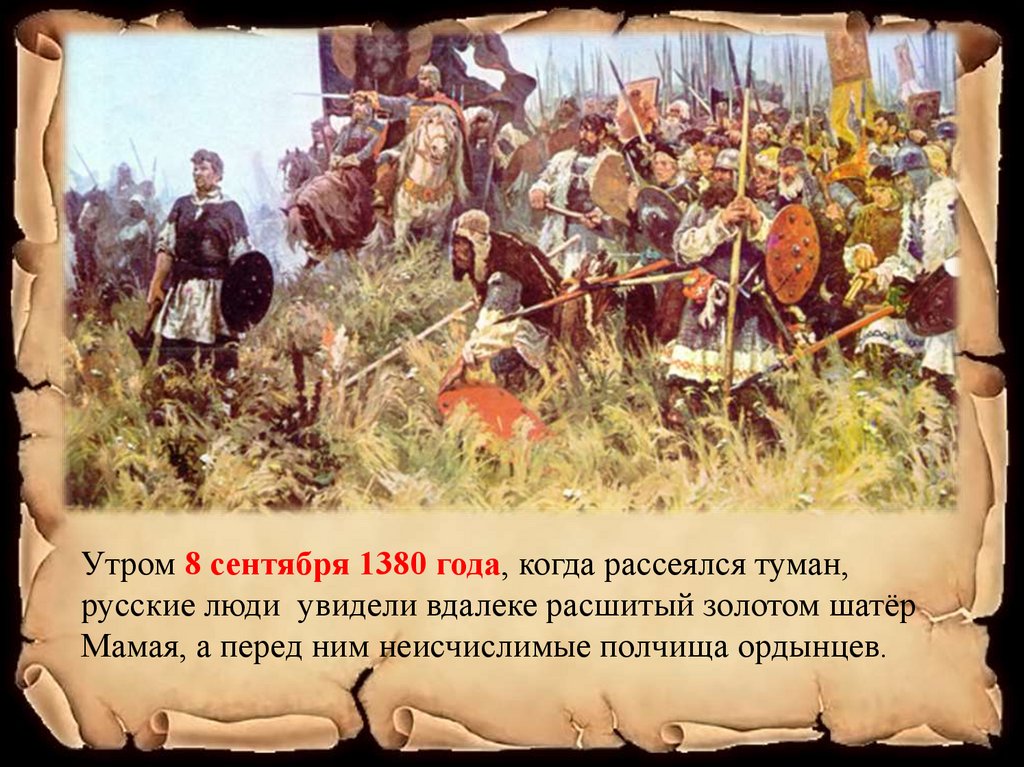 Утром 8 сентября 1380 года, когда рассеялся туман,русские люди увидели вдалеке расшитый золотом шатёр
