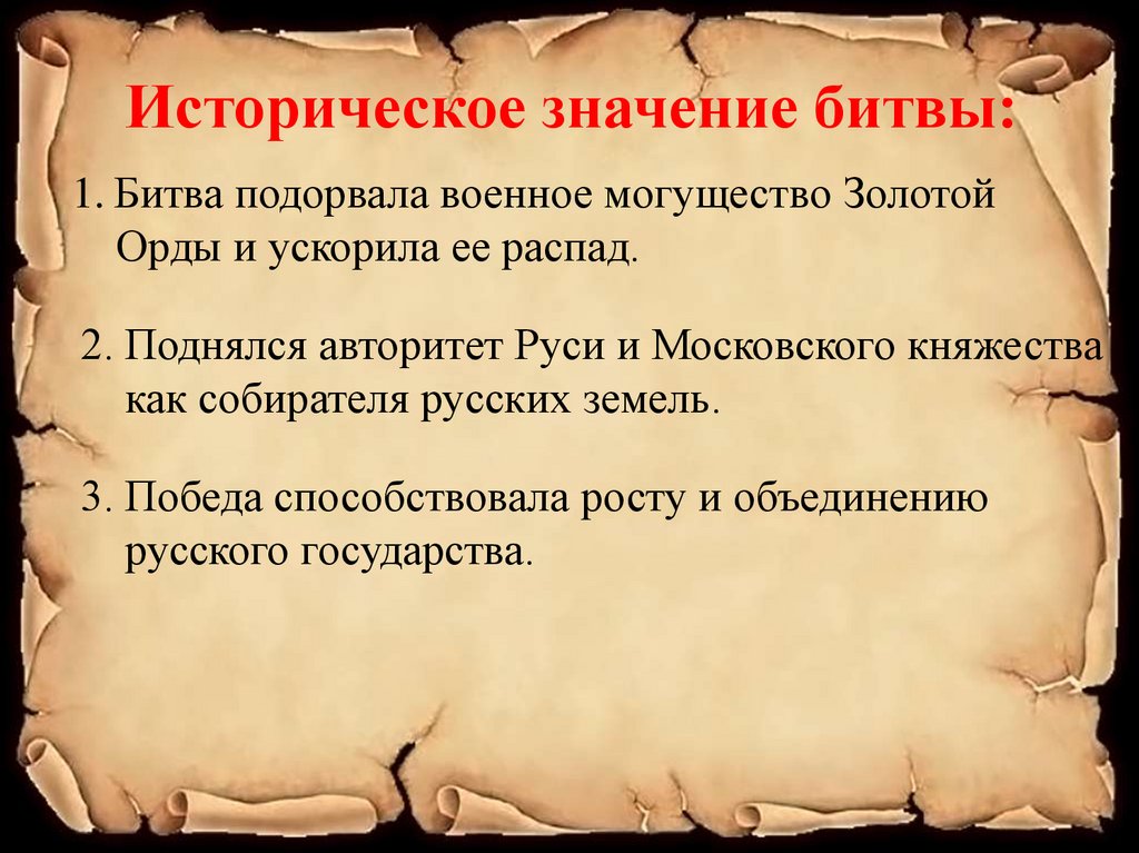 Историческое значение битвы:1. Битва подорвала военное могущество Золотой