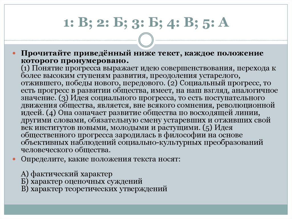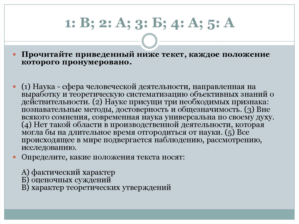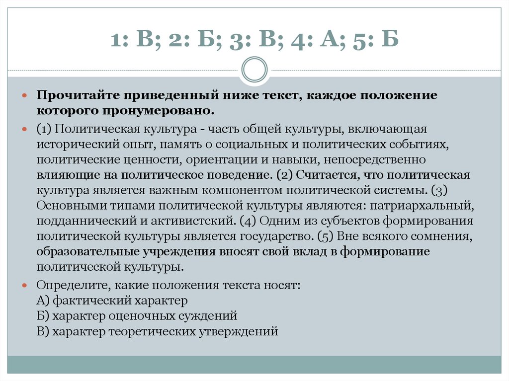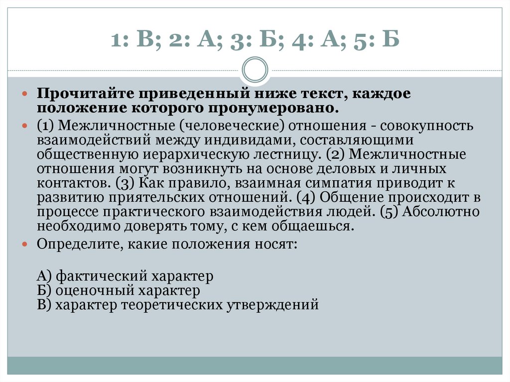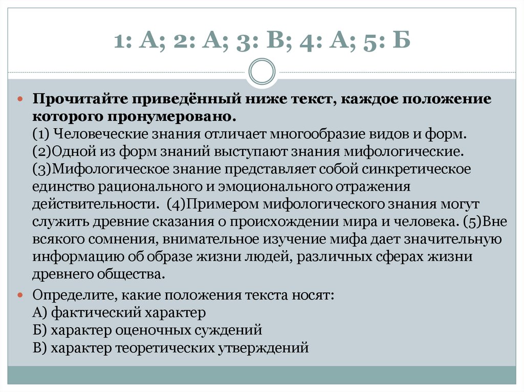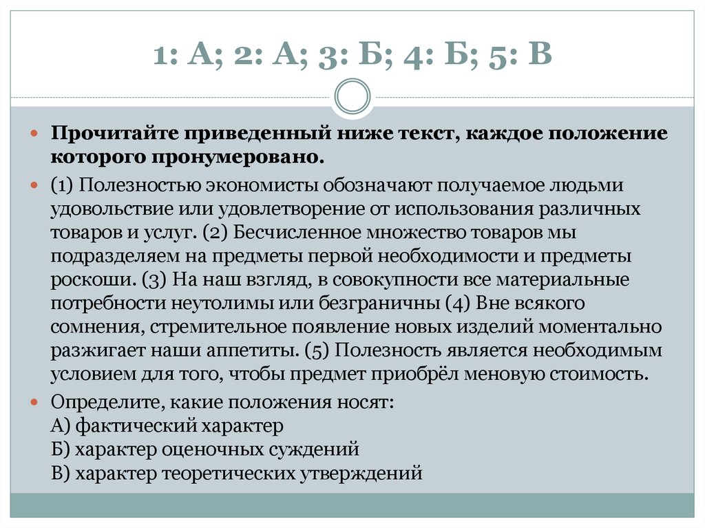 1: А; 2: А; 3: Б; 4: Б; 5: ВПрочитайте приведенный ниже текст, каждое положение