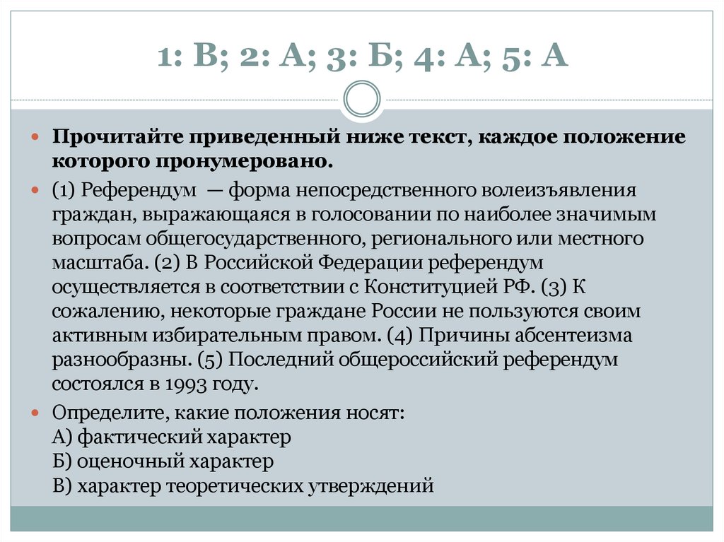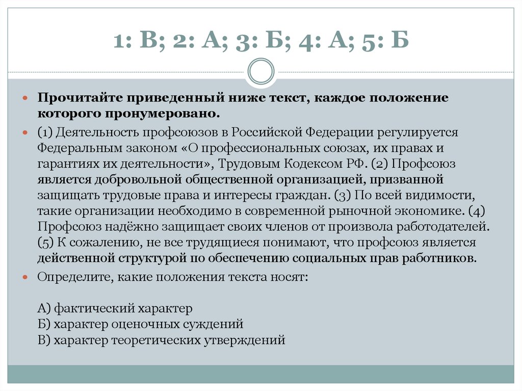 1: В; 2: А; 3: Б; 4: А; 5: БПрочитайте приведенный ниже текст, каждое положение которого