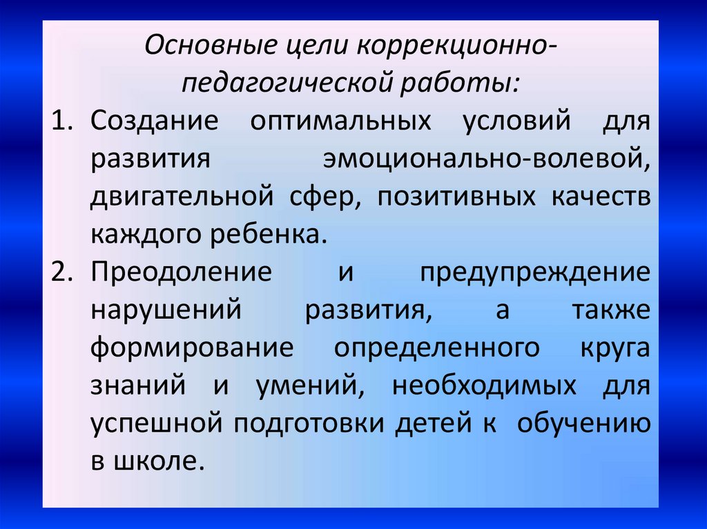 Основные цели коррекционнопедагогической работы:1. Создание оптимальных условий для