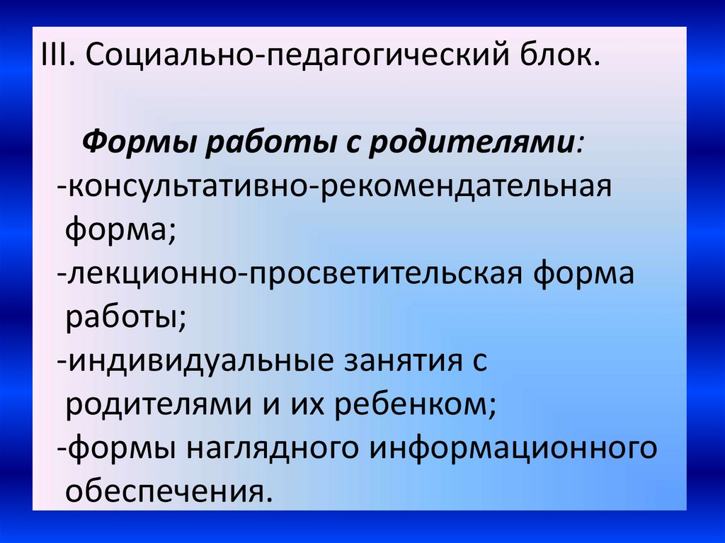 III. Социально-педагогический блок.Формы работы с родителями: