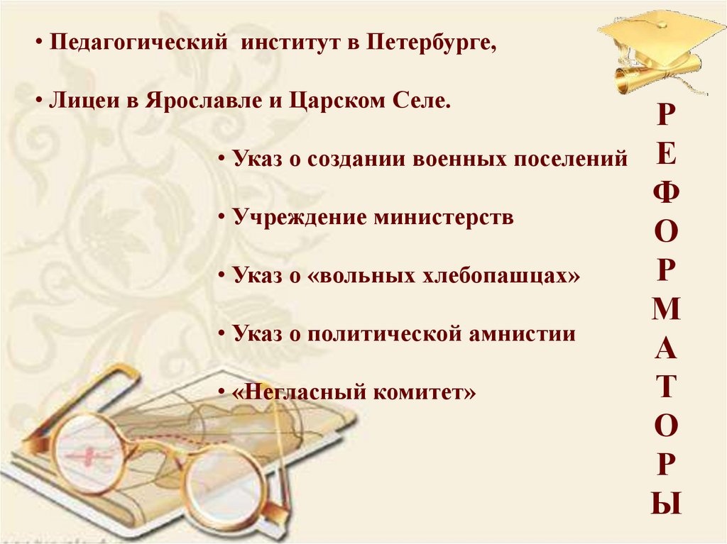 • Педагогический институт в Петербурге,• Лицеи в Ярославле и Царском Селе.