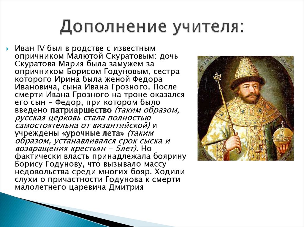 Иван IV был в родстве с известнымопричником Малютой Скуратовым: дочь