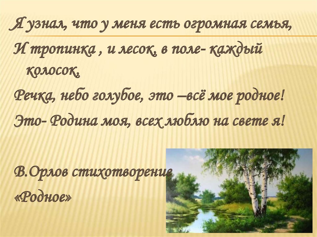 Я узнал, что у меня есть огромная семья,И тропинка , и лесок, в поле- каждый