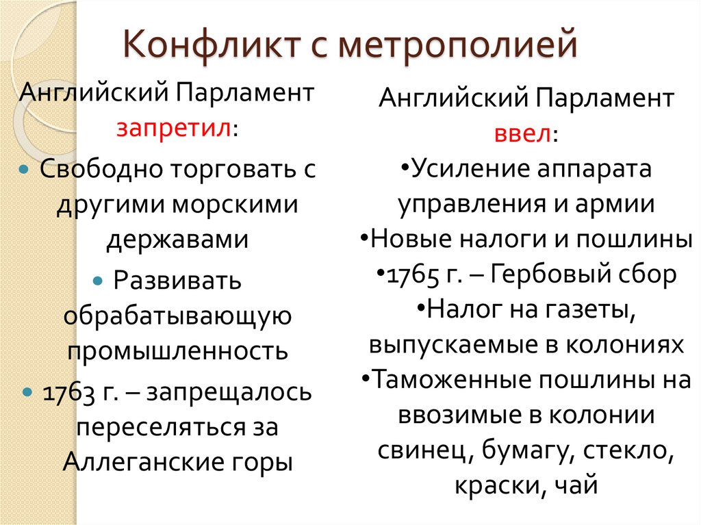 Конфликт с метрополиейАнглийский Парламент