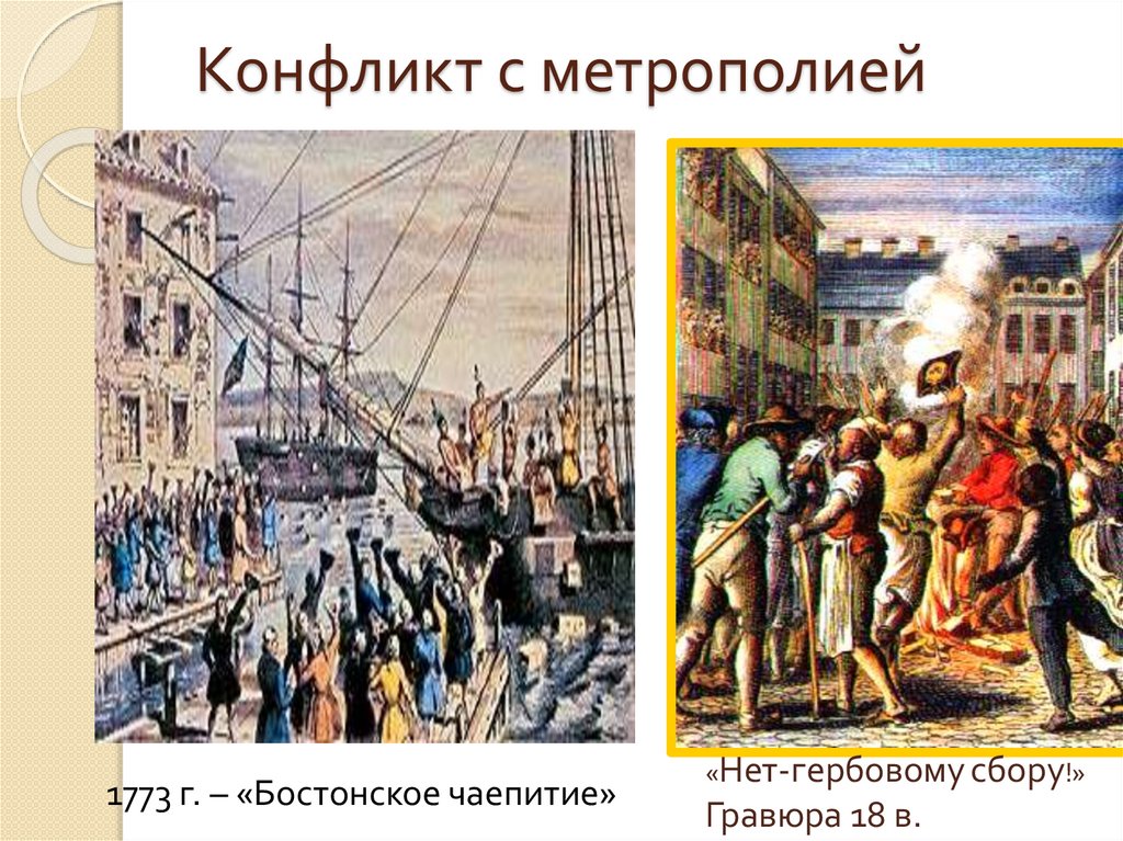 Конфликт с метрополией1773 г. – «Бостонское чаепитие»