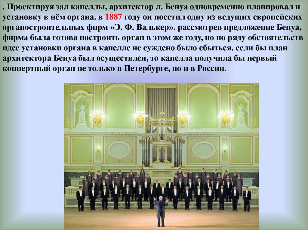 . Проектируя зал капеллы, архитектор л. Бенуа одновременно планировал иустановку в нём органа. в 1887 году он посетил одну из ведущих европейских
