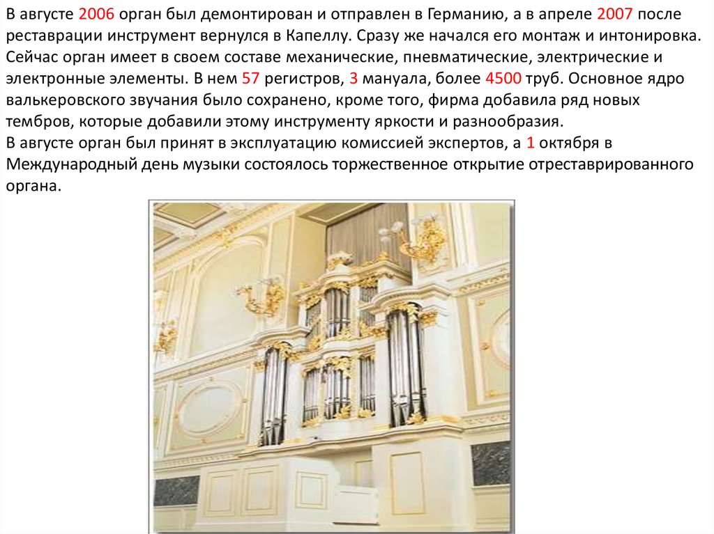В августе 2006 орган был демонтирован и отправлен в Германию, а в апреле 2007 послереставрации инструмент вернулся в Капеллу. Сразу же начался его монтаж и интонировка.