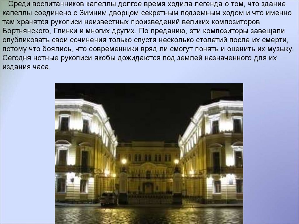 Среди воспитанников капеллы долгое время ходила легенда о том, что зданиекапеллы соединено с Зимним дворцом секретным подземным ходом и что именно