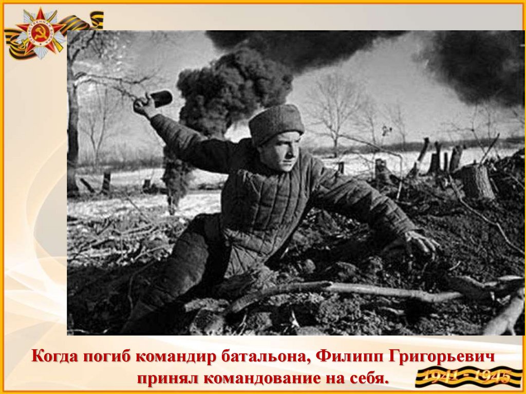 Когда погиб командир батальона, Филипп Григорьевичпринял командование на себя.