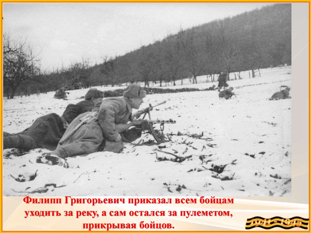 Филипп Григорьевич приказал всем бойцамуходить за реку, а сам остался за пулеметом,