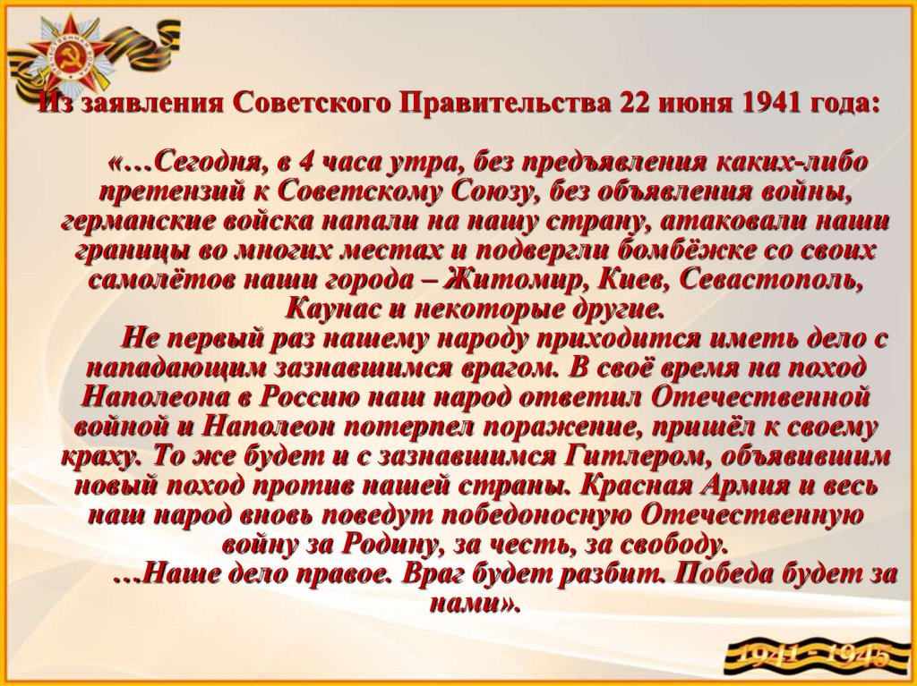 Из заявления Советского Правительства 22 июня 1941 года:«…Сегодня, в 4 часа утра, без предъявления каких-либо
