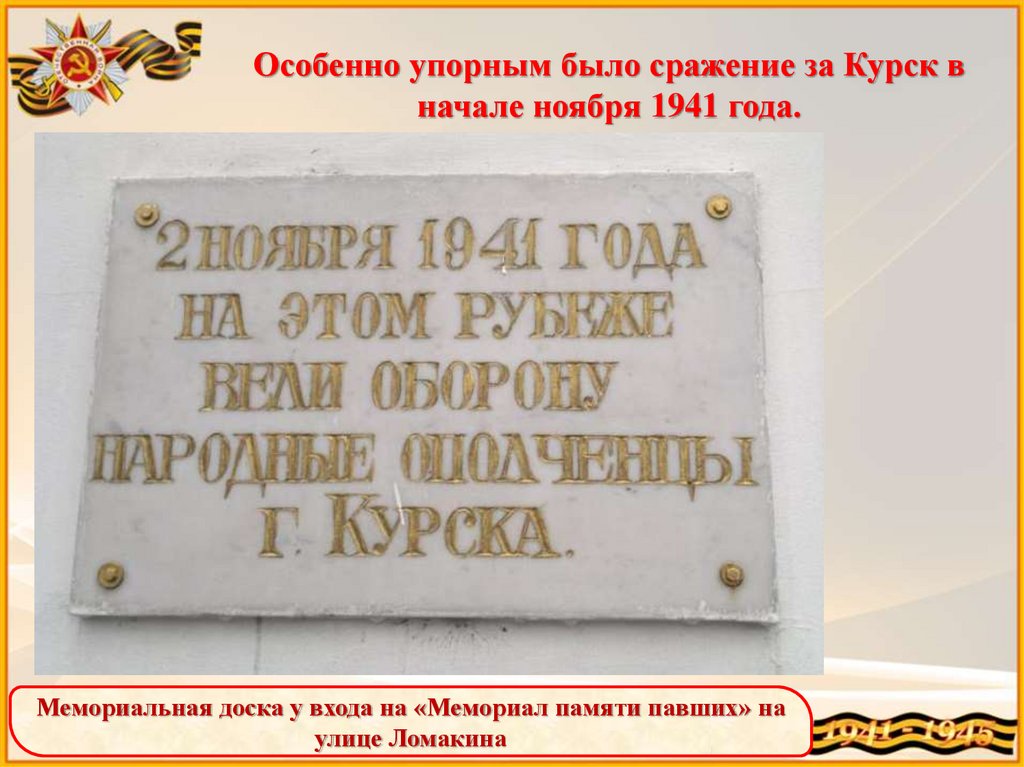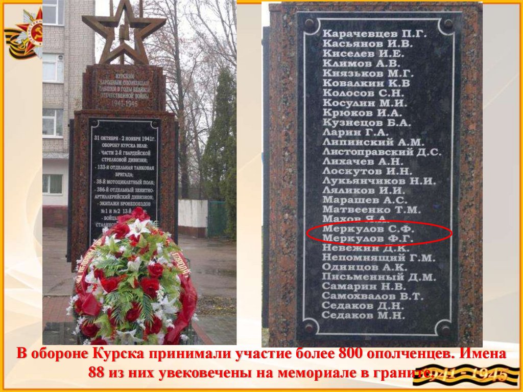 В обороне Курска принимали участие более 800 ополченцев. Имена88 из них увековечены на мемориале в граните.