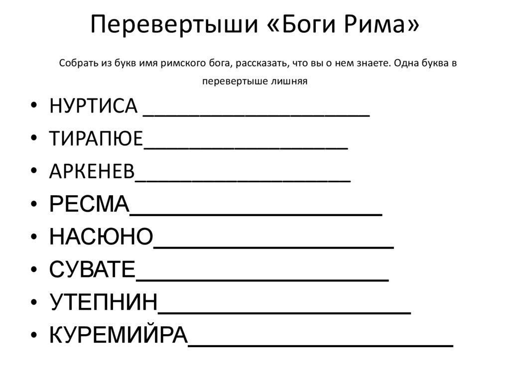 Перевертыши «Боги Рима»Собрать из букв имя римского бога, рассказать, что вы о нем знаете. Одна буква в