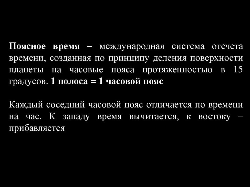 Поясное время – международная система отсчетавремени, созданная по принципу деления поверхности
