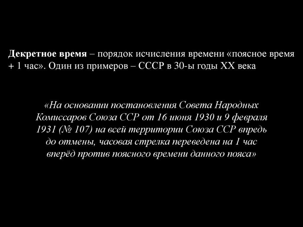 Декретное время – порядок исчисления времени «поясное время+ 1 час». Один из примеров – СССР в 30-ы годы ХХ века