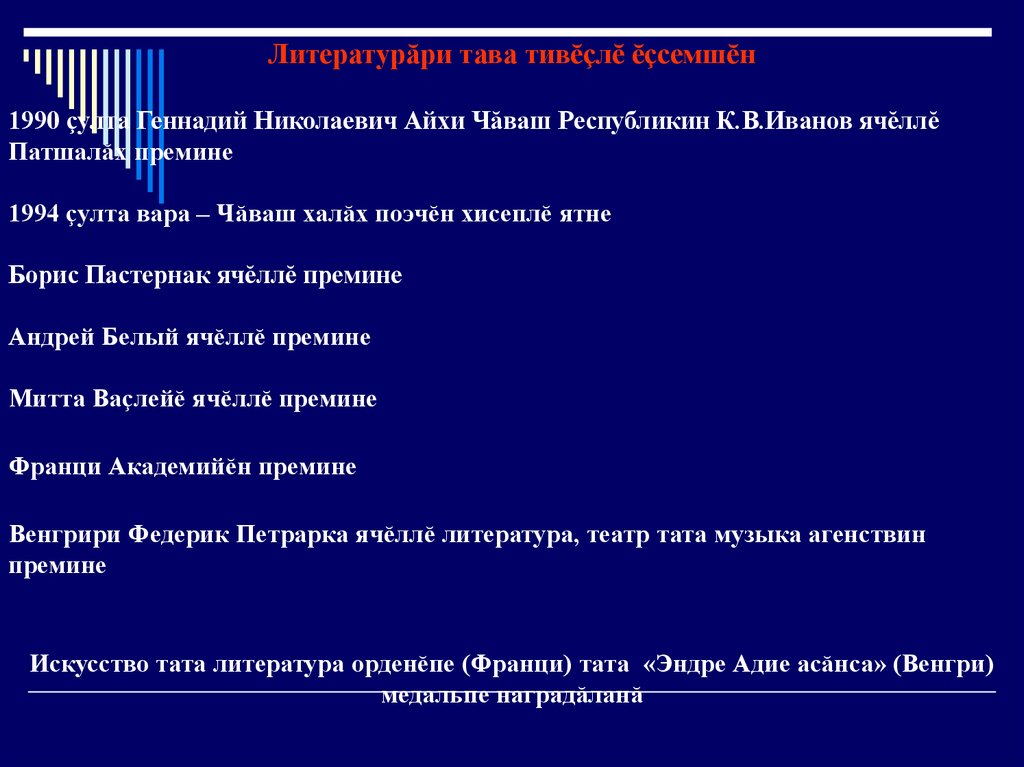 Литературăри тава тивĕçлĕ ĕçсемшĕн1990 çулта Геннадий Николаевич Айхи Чăваш Республикин К.В.Иванов ячĕллĕ