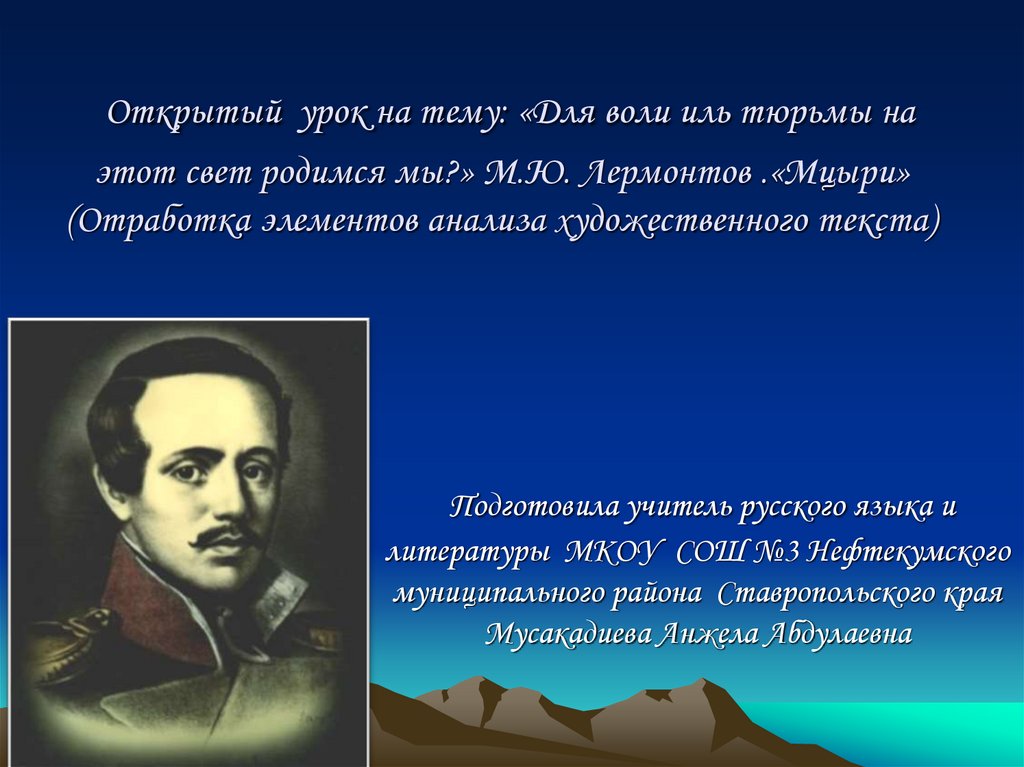 1. Открытый урок на тему: «Для воли иль тюрьмы на этот свет родимся мы?» М.Ю. Лермонтов .«Мцыри» (Отработка элементов анализа