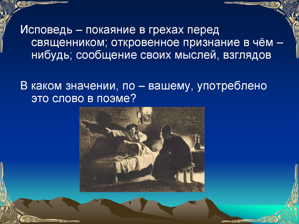 Исповедь – покаяние в грехах передсвященником; откровенное признание в чём –