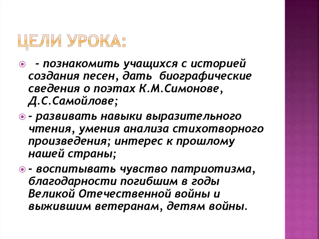 - познакомить учащихся с историейсоздания песен, дать биографические
