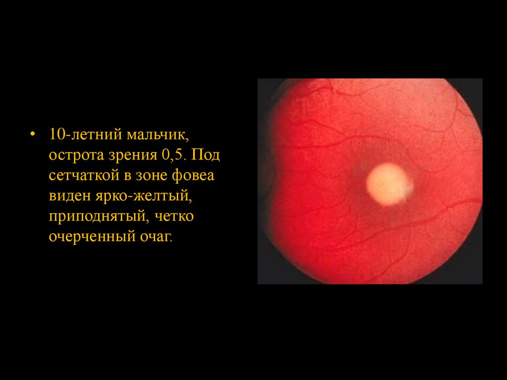 12. Вителлиформная стадия. Под сетчаткой, обычно на обоих глазах. имеется четко очерченный непроминирующий желтоватый очаг поражения. Острота