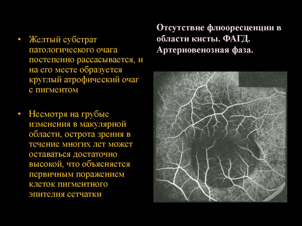 хорошую остроту зрения), зоной гиперпигментации и остатками желтоватого
