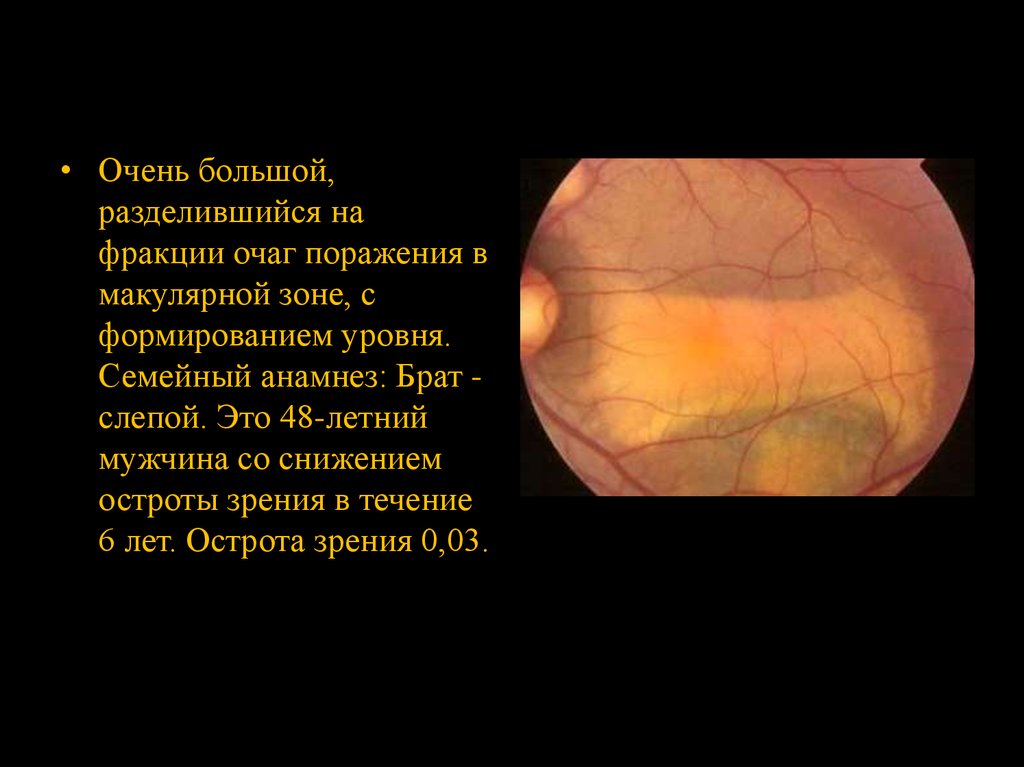 15-летний брат. Острота зрения 0,27. Желтоватыйматериал под фовеа разделился на фрагменты (так