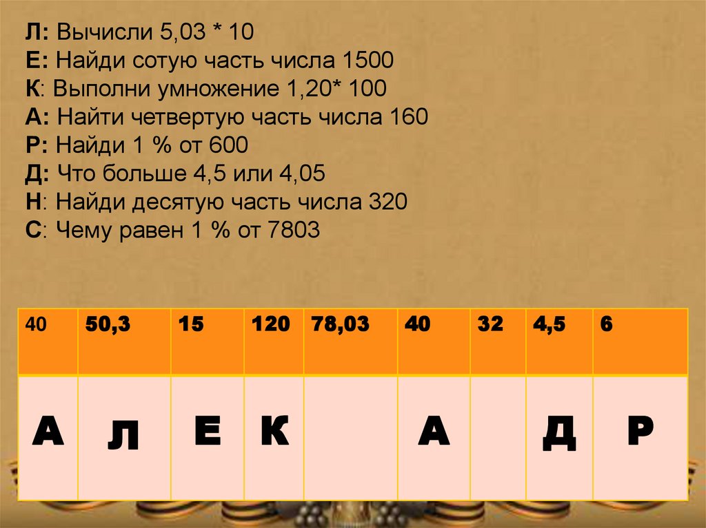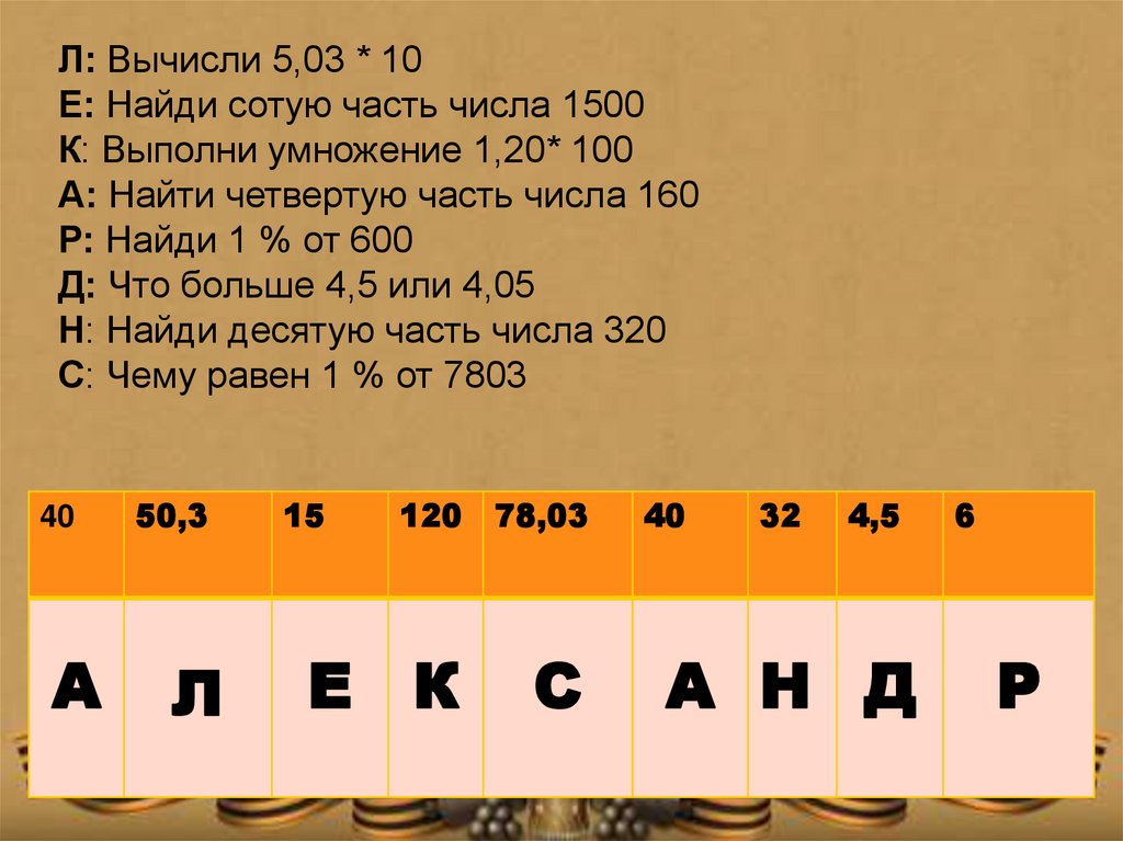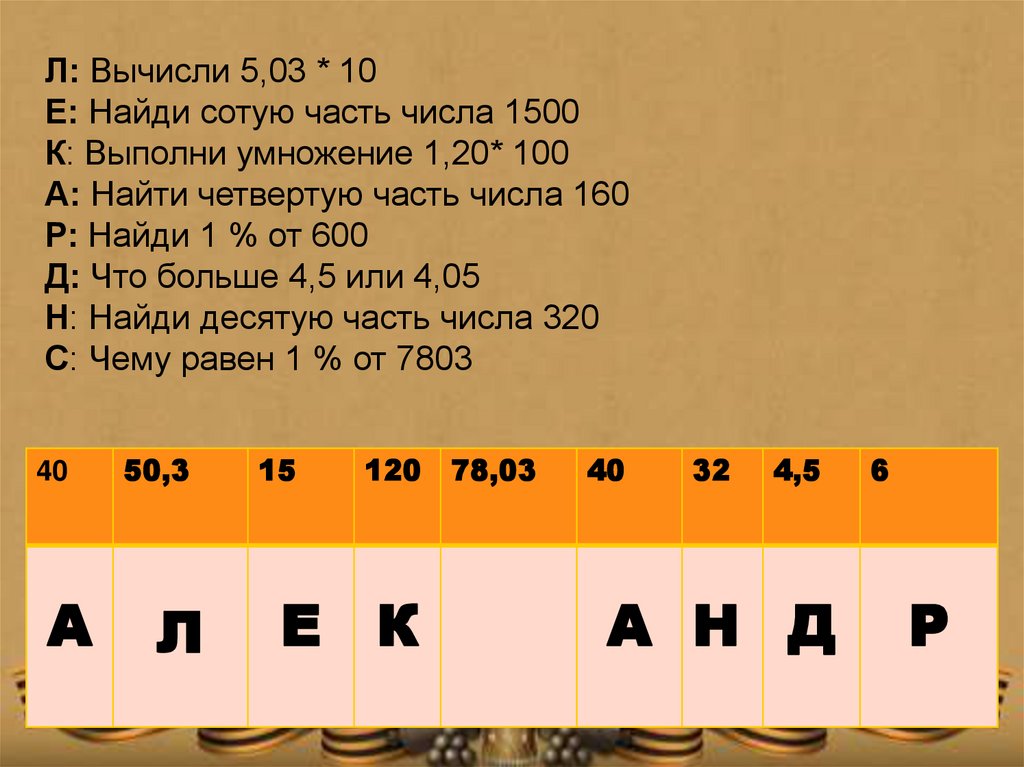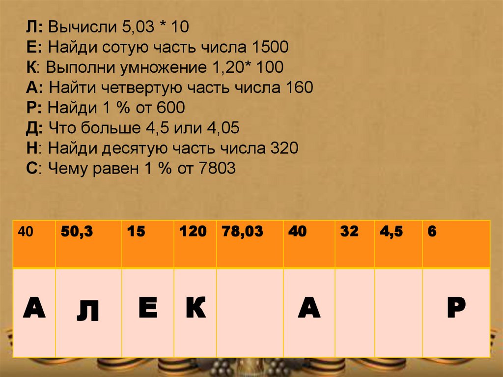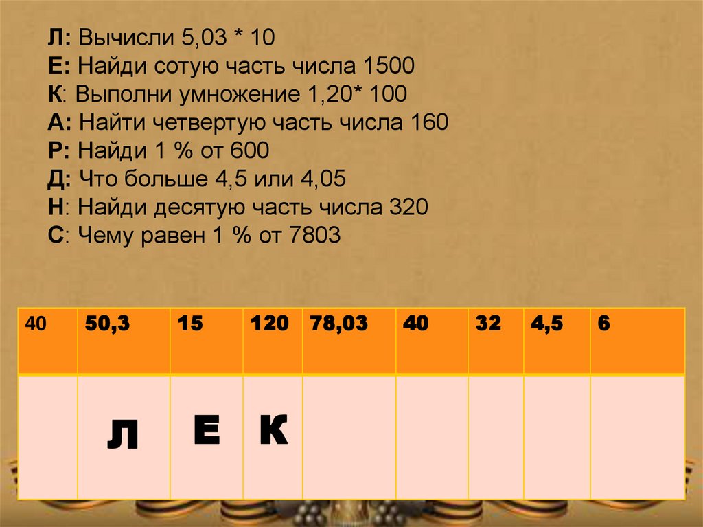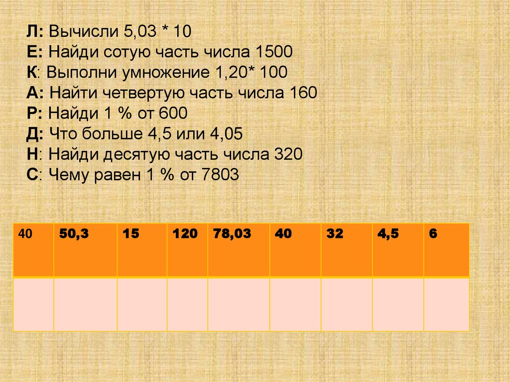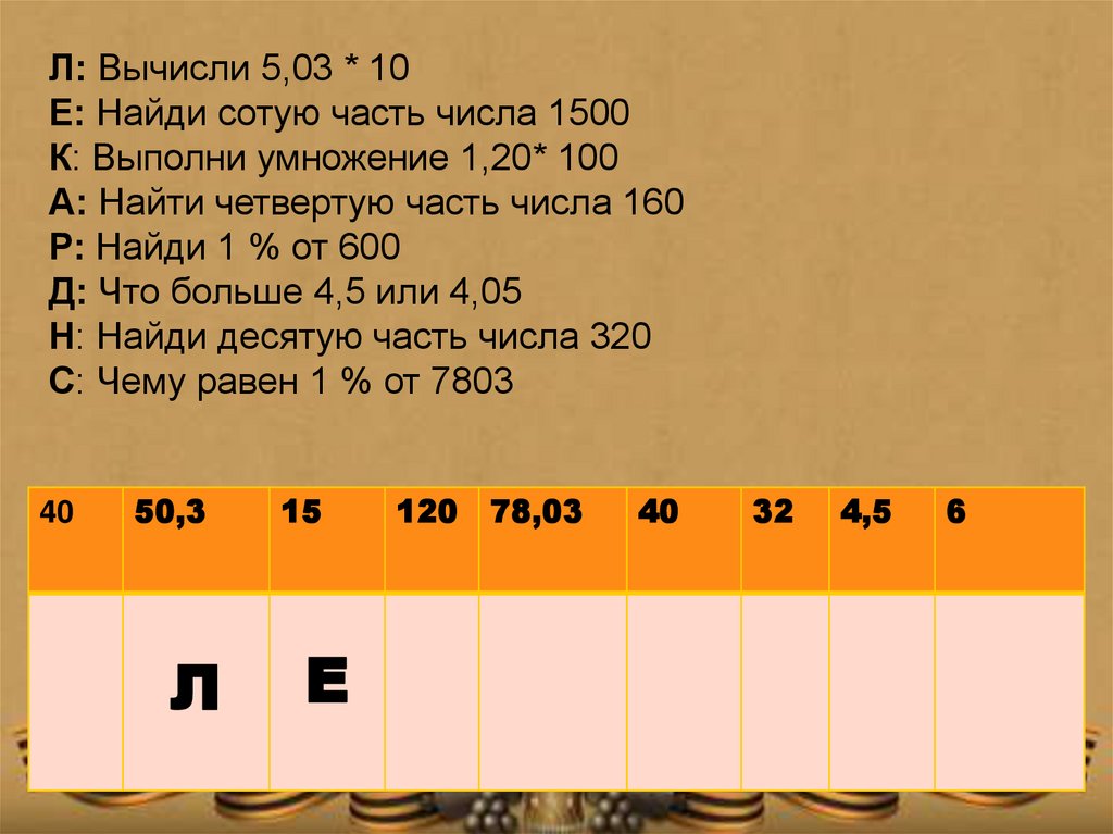 Л: Вычисли 5,03 * 10Е: Найди сотую часть числа 1500