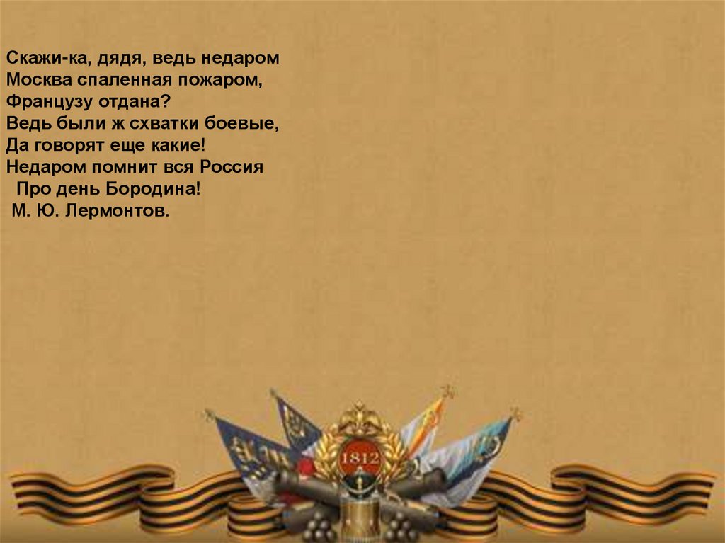 Скажи-ка, дядя, ведь недаромМосква спаленная пожаром,