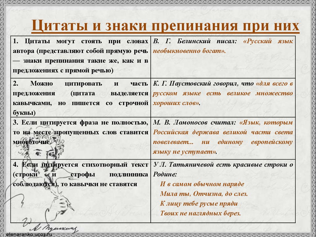 Цитаты и знаки препинания при них1. Цитаты могут стоять при словах В. Г. Белинский писал: «Русский язык