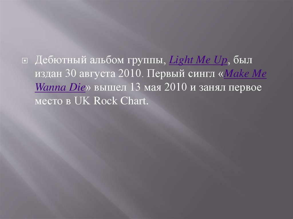 Дебютный альбом группы, Light Me Up, былиздан 30 августа 2010. Первый сингл «Make Me